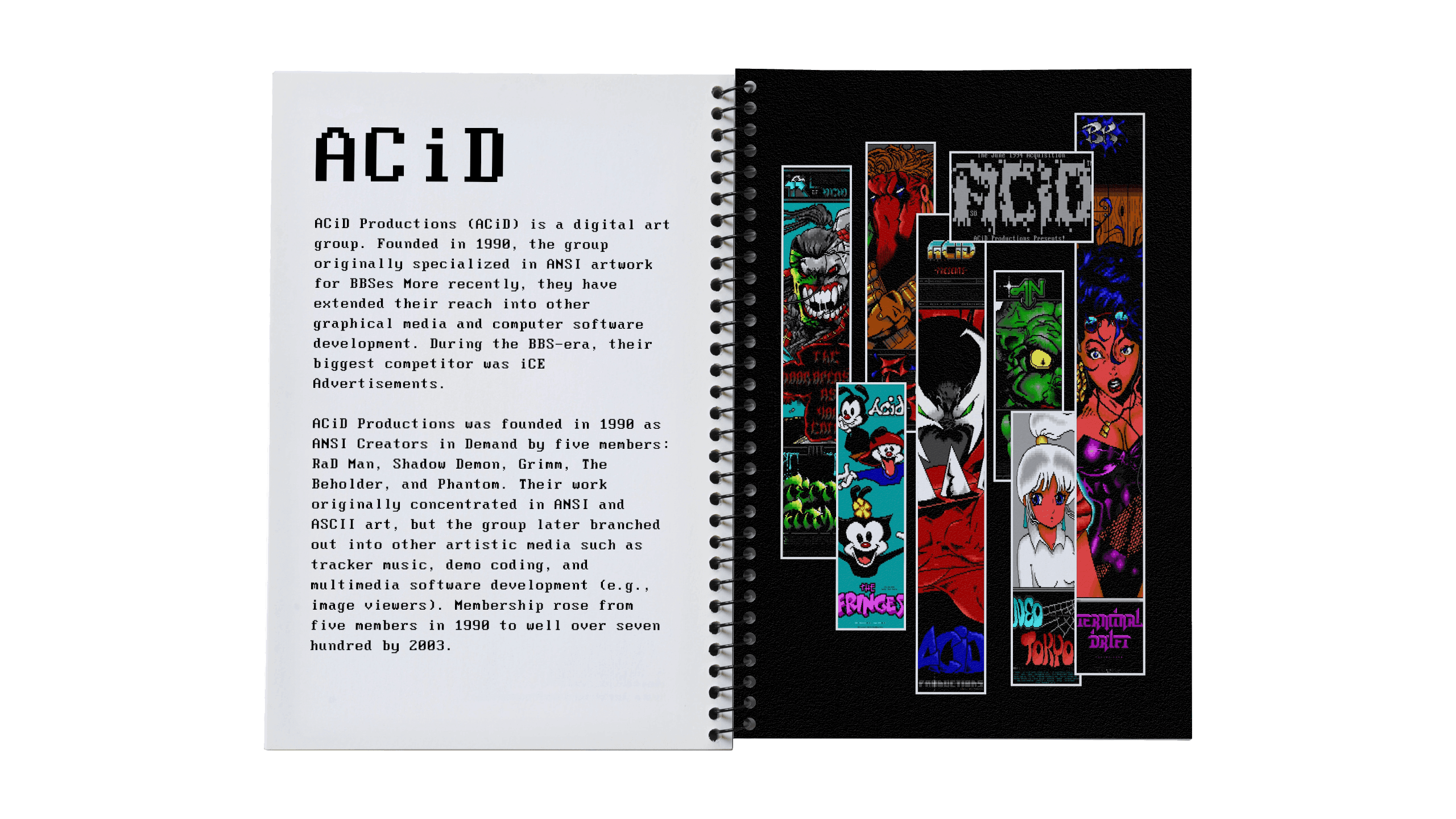A love letter to art of a bygone era. What began as an underground art scene in early 90s Warez cracking groups, transitioned to nearly every forum in the 2000s, with text art found in posts, signatures, comment sections. Some talented artists featured here have pushed the medium further than most, with an avid following keeping the art style alive. Limitations become opportunities through a fixed set of characters, colors, and formats. This is an exploration into and celebration of this highly unique art style.
